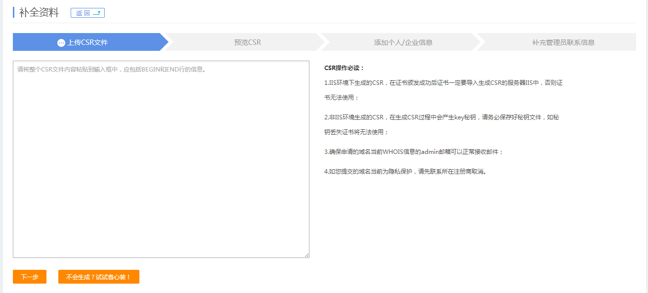 2、点击购买之后,在账户“控制台-SSL证书-我的证书”中找到您之前购买的证书订单,点击右侧操作“去补全”按钮,接下来就需要您提交您想申请的域名和正确的证书请求文件即CSR。CSR其他字段Organization,Organizational Unit,City,State,Country字段的信息,OV或EV证书建议填写中文,以方便厂商后续的审核。请注意:IIS环境下生成的CSR,在证书颁发成功后证书一定要导入生成CSR的服务器IIS中,否则证书无法使用。非IIS环境生成的CSR,在生成CSR过程中会产生key秘钥,请务必保存好秘钥文件,如秘钥丢失证书将无法使用。
